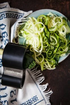 Spaghetti mal anders -mit dem Microplane Spiralschneider schneiden Sie frische Zucchini, Möhren, Gurken, Pastinaken, Rettich oder andere längliche Gemüsesorten in endlos lange Spiralen. Zwei scharfe Klingen aus Edelstahl mit denen dünne und dicke Gemüsesorten jeweils in gleicher Breite geschnitten werden können, liefern dazu das perfekte Ergebnis. Entdecken Sie Pasta neu! Maße: 13,5 cm x 7,5 cm x 5,8 cm