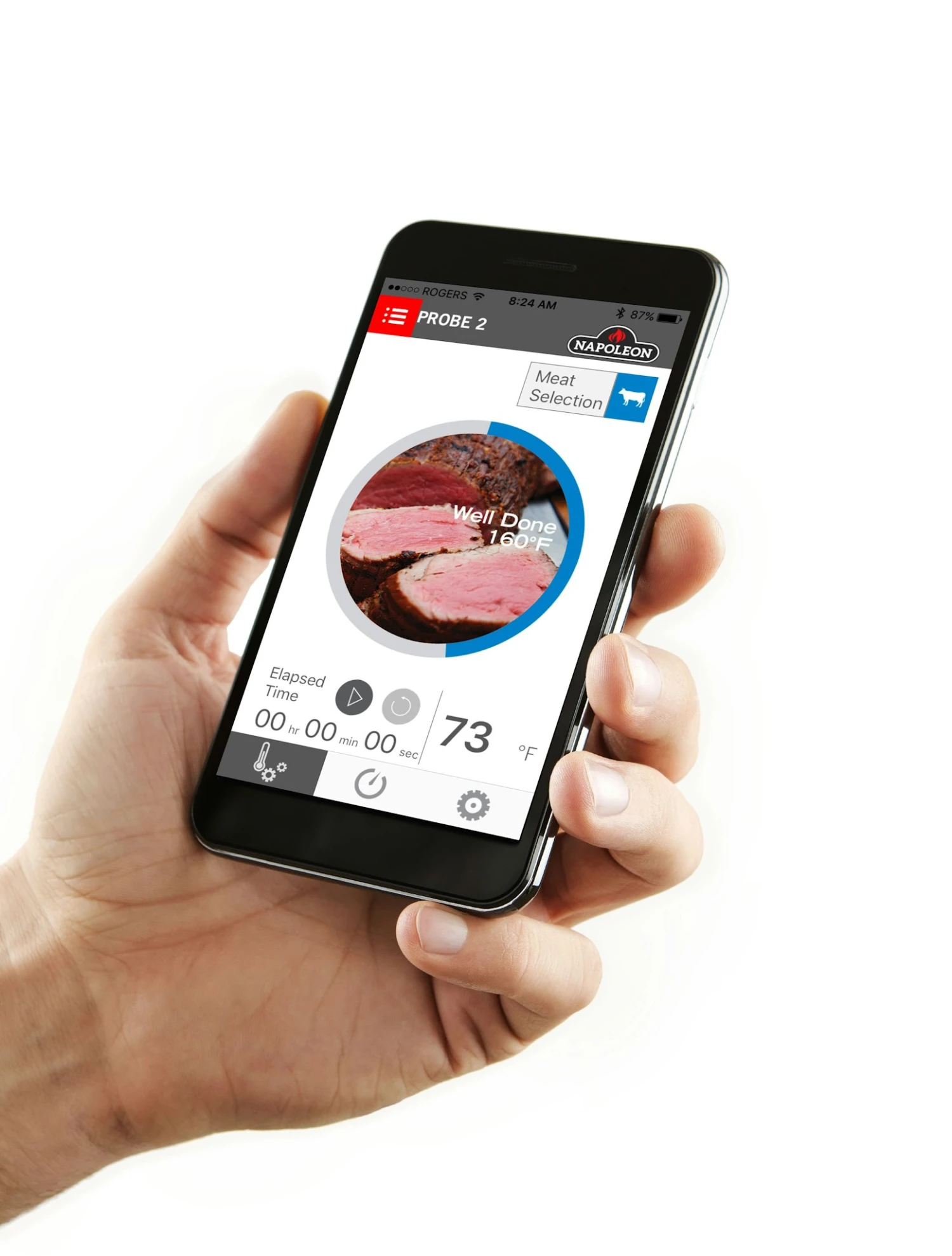 Das NAPOLEON Bluetooth Thermometer inkl. 2 Sonden ist ein hervorragendes Hilfsmittel, wenn es um den perfekten Gargrad ihres Grillgut geht. Sie können mit den zwei Sonden die Kerntemperatur des Grillgutes, sowie die Temperatur in der Grillkammer überwachen und eventuelle Temperaturschwankungen erkennen und ausgleichen. Die Messwerte können direkt auf dem Display des Thermometers oder auf dem Smartphone mit Hilfe der ACCU-PROBE App abgelesen werden.