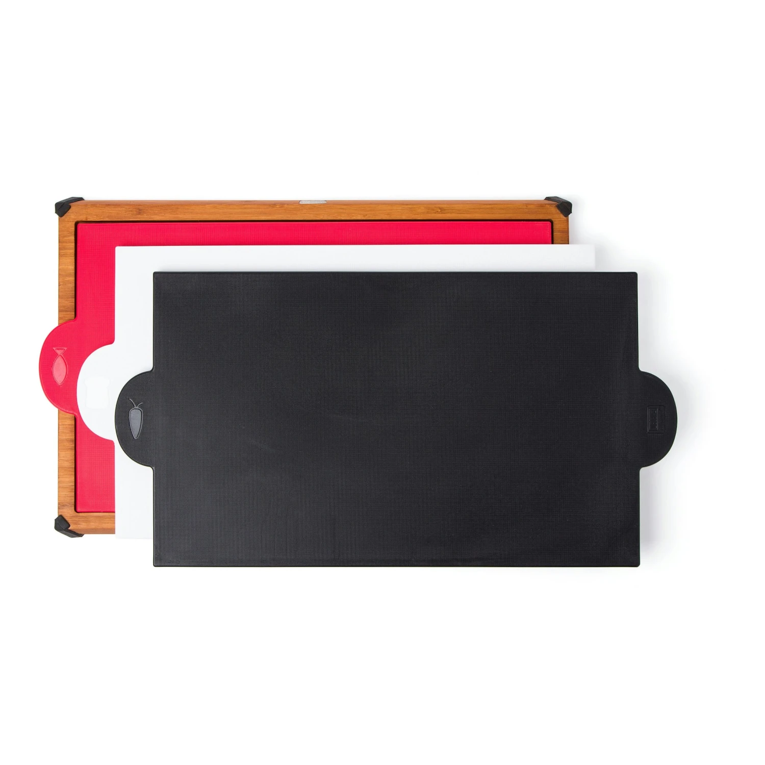 Das rutschfeste Bambus-Schneidebrett wird mit drei Vinyl-Auflagen als zusĂ€tzliche Schneidebretter in unterschiedlichen Farben geliefert, damit Fisch, Fleisch, GemĂŒse oder Brot perfekt getrennt werden können. Ausgestattet mit einer extra tiefen Rinne zum Auffangen von BratensĂ€ften. Damit ist eine sauber SchnittflĂ€che garantiert.